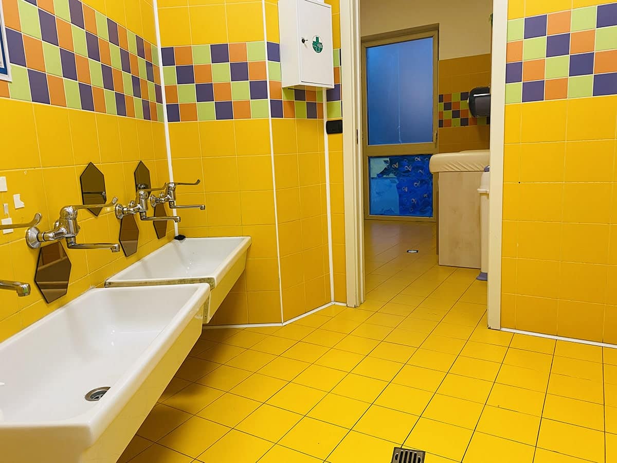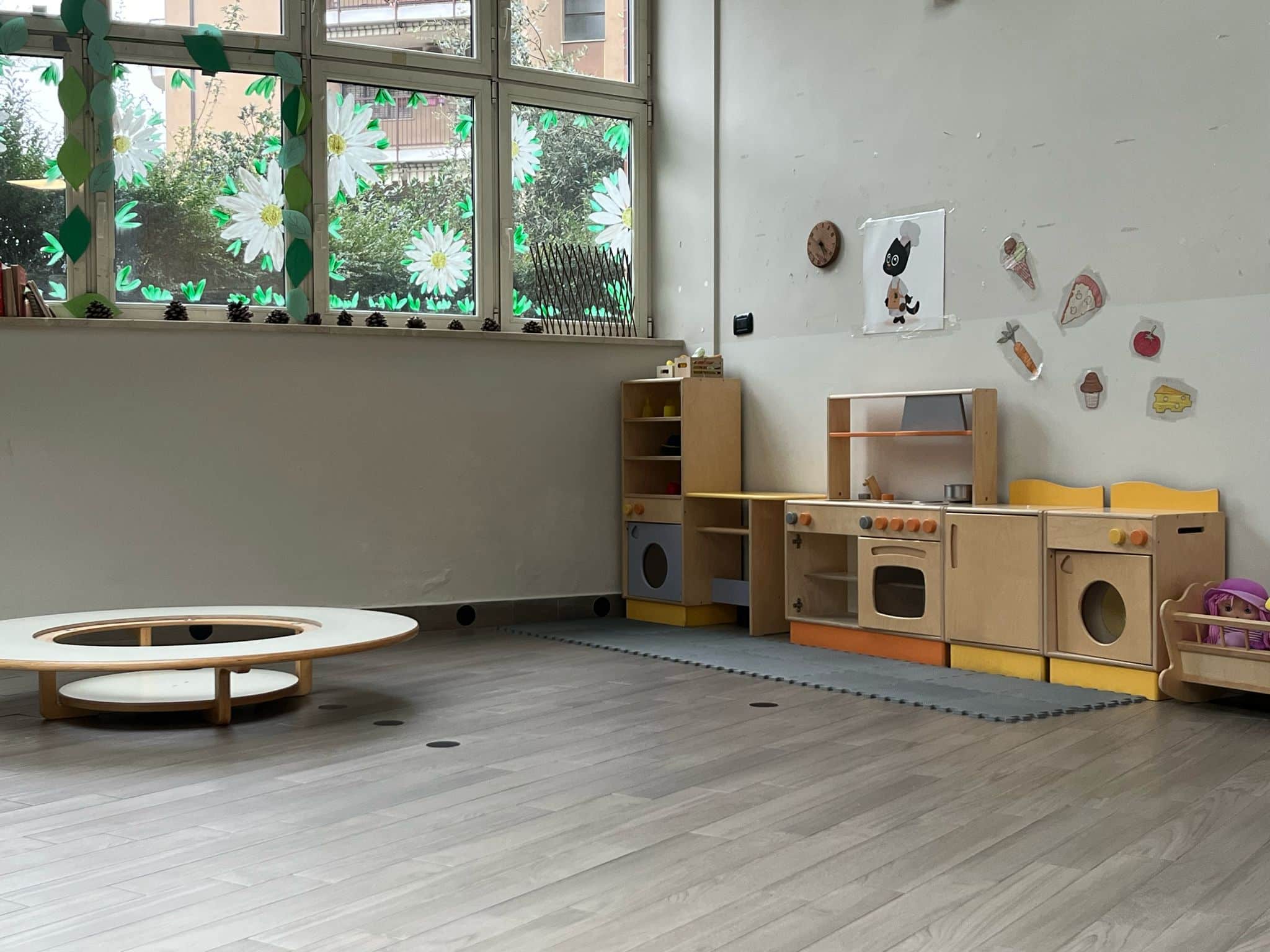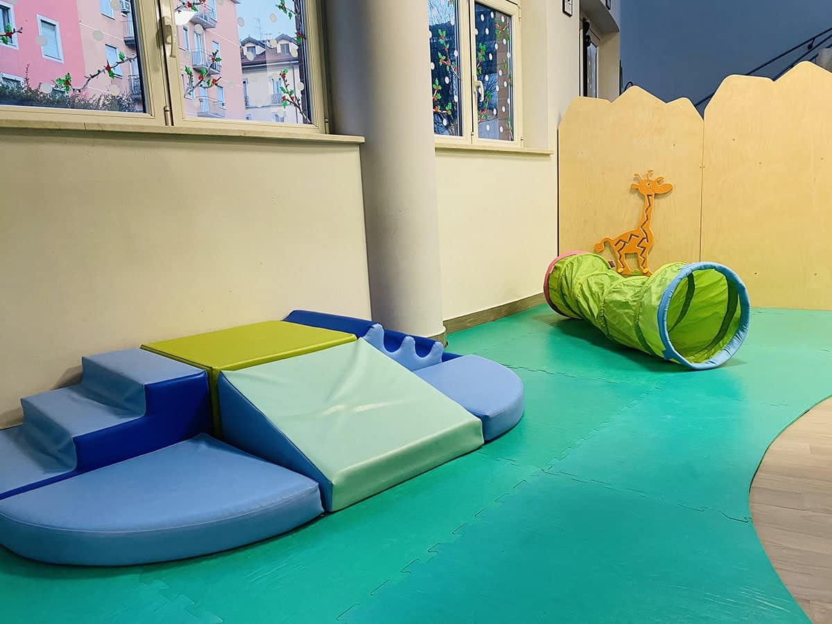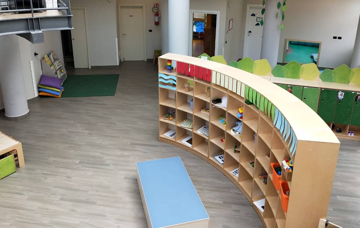 Una volta attraversato il cortile attrezzato si accede alla zona dedicata agli ingressi in cui diamo il benvenuto alle famiglie nell‘area accoglienza con armadietti a misura di bambino. Proseguendo, troviamo la zona dedicata alle attività artistiche e ai pasti, da cui si accede alla zona morbida dove vengono predisposti i percorsi motori, creando ambienti sempre predisposti per rispondere ai bisogni di accoglienza, serenità, movimento, sicurezza, e continuo stimolo alla curiosità e all’apprendimento.