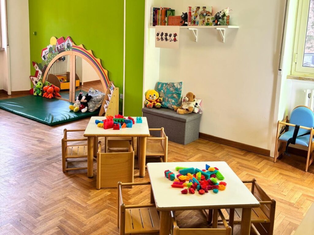 La struttura è composta di un’area esterna situata all’ingresso. Al suo interno dispone di un ampio salone per le attività didattiche, un’altra grande stanza polifunzionale, destinata principalmente al riposo, ma che potrà essere utilizzata anche per attività di tipo psicomotorio e due stanze adibite a servizi igienici per bambini. La cucina è interna e i pasti vengono preparati espressi con prodotti freschi di giornata.